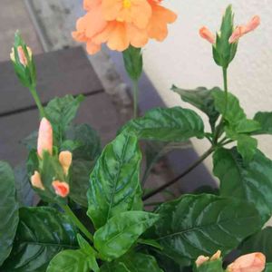 クロサンドラ・スーパーキャンドル 光沢のある葉が素敵です💕 花姿も変わっています💕 和名はかがり火です❣️オレンジの花が、鮮やかです❣️💕