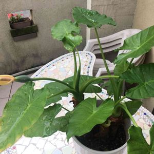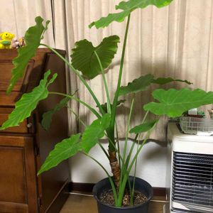庭の花壇の側に勝手に自生していたクワズイモ君、 私の嫁ちゃんが邪魔だから抜いて処分してと言うのでプラ鉢に移植しました。「オオタニワタリ君とモンステラ君!仲良くしてやりなさい」「は~い」 めでたし、めでたし。( ´艸`)
