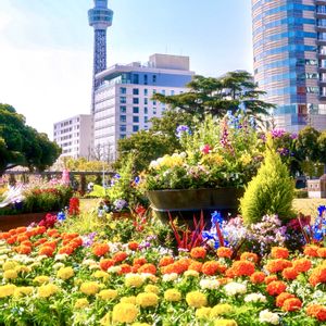 山下公園より 気分が上がる色合いの花壇越しに マリンタワーが見えました🗼💛🧡💚