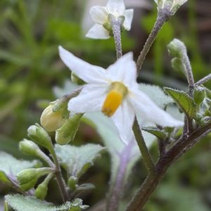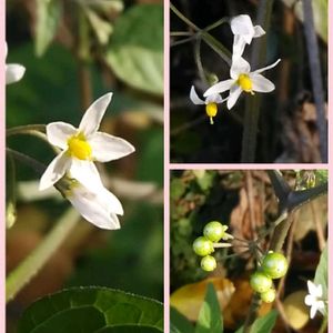 ①②イヌホオズキ ナス科ナス属 一年草 別名はバカナスとも呼ばれ、ホオズキやナスに似ているが役に立たないことから名づけられた。 日本全土に分布 畑や道端、荒れ地などに生える。 史前帰化植物 高さ30〜60cm 葉は長さ3〜10cmの広卵形で先端は鈍いかわずかに突き出し、基部は丸いかくさび状である。 花期7〜10月 散房状に4〜10個の花を付ける。 花はナスに似ており、花冠は径6〜7mmで白色。先が5裂して裂片の先が尖る。 雄しべ5個、雌しべ1個、葯は長さ2mmほど。 黄色い雄しべが突き出している。 今年は暖かかったため11/23でも、まだこんなきれいにお花が咲いていました。 ③ハキダメギク キク科コゴメギク属 一年草 熱帯アメリカ原産 日本には明治時代初期に渡来した。 道端や庭などに生える雑草 高さ15〜40cm 枝葉ともに白い毛が生える。 葉は対生し、卵形から卵状披針形で、波状の浅い鋸歯がある。 花期6〜11月 頭花は径約5mmで、周りに先端が3中裂する白色の舌状花がふつう5個並び、内側に黄色の筒状花が多数付く。 🏷️白い水曜日♡ に参加させていただきます。