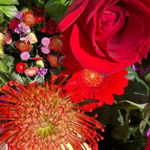 開店祝いの花の中にあったピンククッションと赤い薔薇の花です。