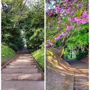 池への結構長い階段坂道。息切れしながら登り切ると八重桜が出迎えてくれました。