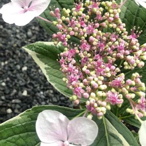 斑入り紫陽花 葉の縁がピンクに紅葉してて可愛い♪ 開き始めてきましたねぇ。