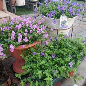 おはようございます‼️ いい天気☀️(*≧∀≦*) 私史上最高のPW‼️ てゆーか、私史上イチ推しのPW‼️ スーパートレニア カタリーナ ブルーリバー🎵 ピンクリバーもかわいいよ🤭 今年で3回目ですが、毎年育てています😃 今までで史上最高の鉢を使用‼️(白いのが32型) 手前のブルーリバーは挿し芽ちゃん🎵 切り戻しまくっているので、貴重な咲いてるお花です😆