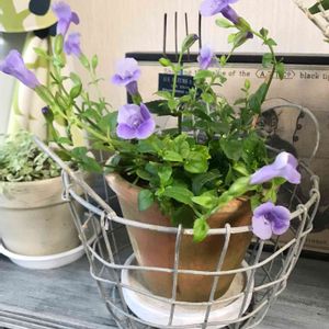 ✨スーパートレニア✨ ハンギングバスケットにしてみました🎵 この間初めてスリットバスケットというのを作り、今回はこのハンギングバスケットにチャレンジしてみました。 今日の横浜は雨ですが、この子達は出したまま☔💦 鉢は全部ではないけど軒下と玄関の中に避難させました。