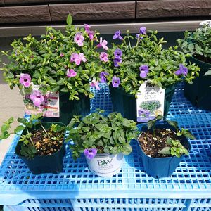 室内越冬OKのPWアンバサダー花苗さん達です💕 ユーフォルビア ダイアモンドフロストとアンゲロニア エンジェルフェイスはずっと咲き続けています✨ エボルブルス ブルーラグーン(自宅の)とスーパートレニア カタリーナも少し咲き始めました❀.(*´▽`*)❀. GW過ぎた頃✨外に慣らしつつ出します👍