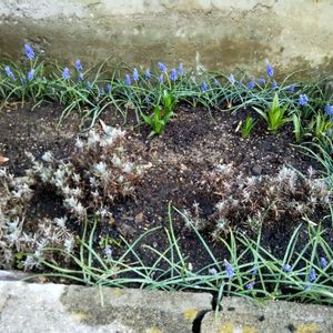 掘りあげた大量のムスカリ球根🍇 余った分を空いた痩せ地に植えておいた。 猫🐱ちゃんに掘りあげられ、何度も霜被害に遭遇したけど、咲いた🎵 ここが日当たり良くて、ムスカリ開花一号🎉