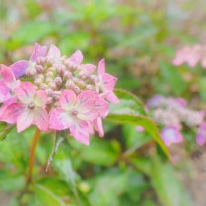 ヤマアジサイ 八重甘茶 お迎えして3年目になりますが ずいぶんと大きくなりました このアジサイは 咲き始めは白っぽく 徐々にピンク味が強くなり さらに咲き進むと青味を帯びてきます なので 一株の中にグラデーションを見ることが出来 しかも花の姿は房によって装飾花ばかりに見えるものや 両性花も多かったり少なかったり とても不規則で自由 なかなか楽しみの多い花です