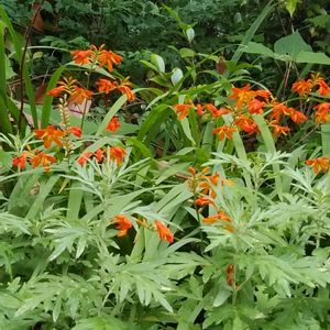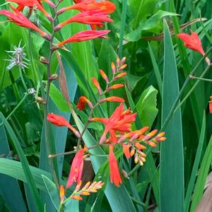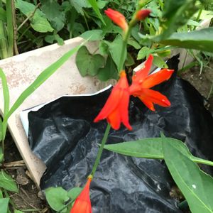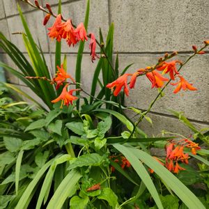 ヒメヒオウギズイセン(モントブレチア):グラジオラスの様な葉で細かい赤い花がさきます。元気でも咲かない球根があります。