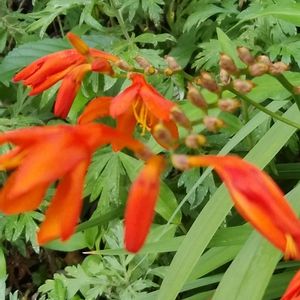 こんにちは😃❤️🧡💛 今日水かけに行った時見つけました🥰👍 裏庭に咲いていましたヨ♪(๑ᴖ◡ᴖ๑)♪🧡💛🧡💛🧡💛 ◎ モントブレチア 花言葉:良い便り、楽しい思い出、清楚な人、謙譲の美、陽気、気品、芳香 誕生花:8月15日 9月4日 原産地:南アフリカ(ケープ東部地域) 渡来時期:明治時代中期 生育地:当たりが良い場所か半日陰の場所など 学名:Crocosmia 英名:Montbretia 和名:ヒメヒオウギズイセン(姫檜扇水仙) 別名:クロコスミア 目名:ユリ目 科名:アヤメ科 属名:モントブレチア属(クロコスミア属) 草丈:60cm~150cm 開花期:7月~8月 植え付け期:3月~4月 キラキラと咲いていました🥰👍 午後からもこまめに水分補給してお過ごし下さいネ。 (((o(*゚▽゚*)o)))❤️🧡💛🧡💛🧡❤️🌿🌿🌿🌿🌿
