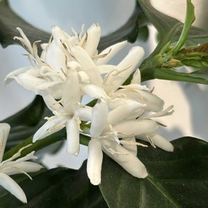 コーヒーのお花が咲きました❣️ 300円ぐらいの小さいポット苗から育て始め5年?6年ぐらい経ちますかね! 少しずつ鉢増ししてあげ、昨年秋にとうとう直置きサイズになりました〜😆 場所も変えてしまったから、またお花を咲かせてくれるか心配でしたが、問題無く咲いてくれて嬉しいです🥰