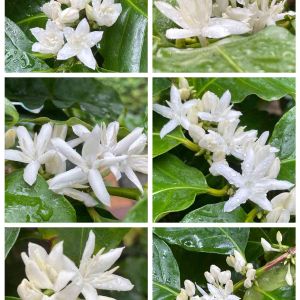 コーヒーの花 コーヒーの花、今年2回目が咲きました。 白くて綺麗で、ジャスミンのような香り。 週末の雨上がり、実を付けた枝の 先の方にたくさんの蕾があります。