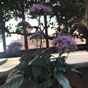 霞みがかったような佇まい ふんわり優しげな花姿(^^)v ワインレッド&ライラックの 二色植え 花房の割に細い茎が くねり気味なので支柱を 花位置が落ち着かな~い;;