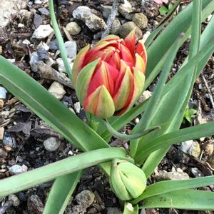 おはようございます🌞 2年目のチューリップ、とても小さい💕 でも、緑と赤のコントラストがいい感じ😊