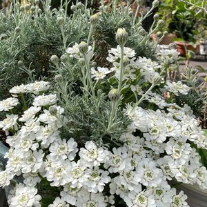 おはようございます♪ ローダンセマムの 変な風に伸びちゃった枝の周りを イベリス🤍が 囲むように咲いています🤍 この部分だけでいい感じかも〜🫢💕ローダンセマム早く咲かないかなぁ〜😊