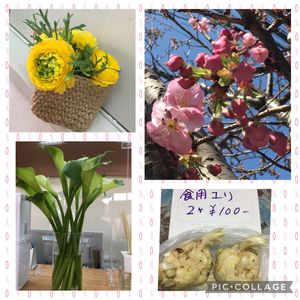 左、今日行った病院の花、ラナンキュラス可愛い💕。カラー、爽やかな花でした。右上、駅前のサクラが咲き始めました。右下、食用ユリが安かったので買いました。どんな花か前から見たいと思っていたので植えて見ます^o^。