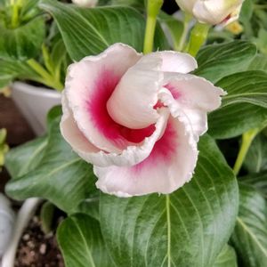 溢れ種で 白い🤍ニチニチソウが生えてきたので 鉢に植えてみました…😃 広い庭では…ピンク🩷のニチニチソウ… 赤い❤️…🤍❤️ニチニチソウは 大きくなってきたので 挿し木で増やすつもり…😊🎶