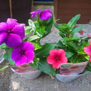 ミニ薔薇の根元では 同じニチニチソウビンカが ヒラヒラフリルのお花に変身👀‼️ お花の色も違います🧐