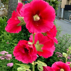 タチアオイ ちゃんです。 三色 咲きました。 茎についている蕾の、姿も かわいかったので💞、コラボしました。 暑い日 お気をつけくださいね。