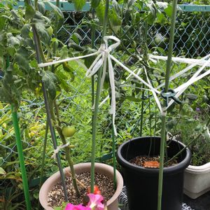 8/10☀️晴れ おはよーございます(^_^)私のミニトマトずーっとこんな感じ🍅支柱を鉢の周りに立てて紐を張ってます。未だ未だ花も咲いてトマトも着きます、だけど...スズナリの着実が希望です🤔🤔🤗