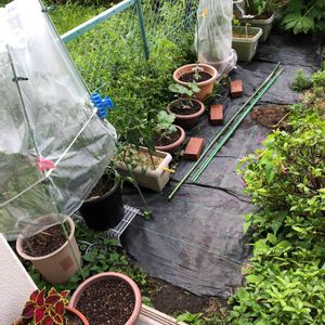 6/28(金)おはよーございます🌫🌂🐦台風3号に備えて避難した鉢植え野菜^_^思った程ではなく狭いベランダから庭に戻してあげました