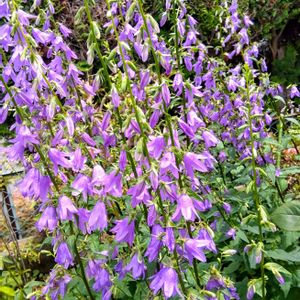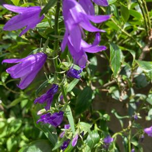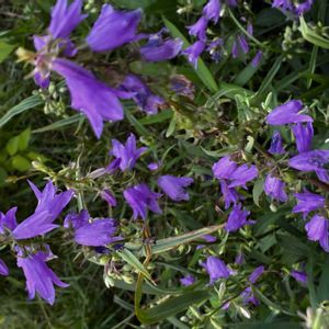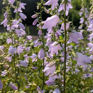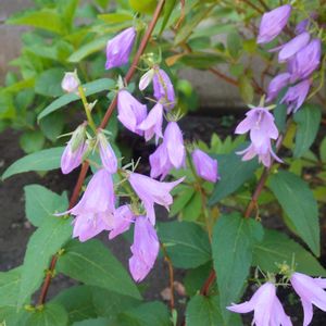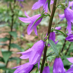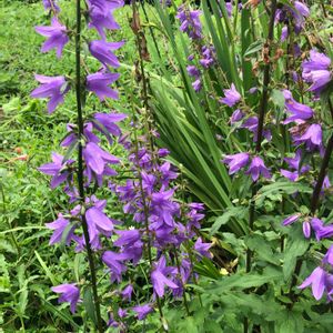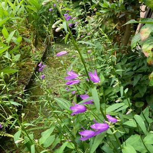 ハタザオキキョウ キキョウ科ホタルブクロ属 多年草 ヨーロッパ原産 帰化植物 日本には大正時代に入ってきた。 花期5〜7月 旗竿のような真っ直ぐな茎にびっしりと花を付ける。 丈は50〜80cm 茎頂に長い花穂を伸ばし、紫色で先端が5裂した鐘形の花を下向きに多数付ける。 緑色の萼片は5枚で軽く反る。