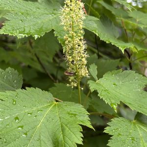 オガラバナ (麻幹花) ムクロジ科カエデ属 別名:ホザキカエデ 花期:6〜8月 ・3〜10mの落葉小高木 ・長さ8〜15㌢の葉は対生し、掌状 に5〜7裂する。 ・裂片の先は尖り欠刻状の鋸歯あり ・葉柄は長く、赤みを帯びる ・花は枝先に10〜20㌢の円柱状に 付き黄緑色の小さな花を多数付け ます。 ・花序には雄花と両性花が混じるそ うです。 見た場所、日にちも違いますが、花友さんが投稿されたのを見て追っかけ投稿させていただきました✌️ 📷 2025/8/5