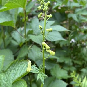 オオバミゾホオズキ(大葉溝酸漿) ハエドクソウ科エリスランテ属の多年草 ・茎は分枝せず、直立又は斜上する ・葉は対生で卵形~卵円形。10対程 度の鋸歯がある ・葉の基部は円形で無柄 ・葉脈は平行脈 ・花は上部の葉腋に数個つく 3️⃣長い花柄がある ・黄色い花冠はラッパ形、上唇は2 裂し、下唇は3裂する ・花冠内部に赤褐色の斑点がある 木道の側で見られましたが、川のそば近寄れない場所では群生していました。 高尾山で見られるミゾホオズキよりも大きな花でした。 🤳2025/8/5