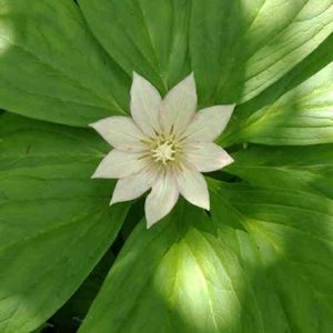 キヌガサソウ(衣笠草) 別名ハナガサソウ(花笠草) 名前の由来は🍀放射状に並ぶ葉の様子が👘奈良時代高貴な人にさしかけた衣笠に似ているからとか… 白い花弁の様に見えるのはガク片(6〜11位) 初め白色⚪️→薄紅紫色→薄緑色に変化❣️ お花の様な白いガク片と周りを囲む大型の葉の数は同じ‼️ お花は5〜10cm位ですが😊囲む葉が大きいので🍀とても目立ちます😊 栂池自然園💐風穴の近くに❄️咲いていました💕