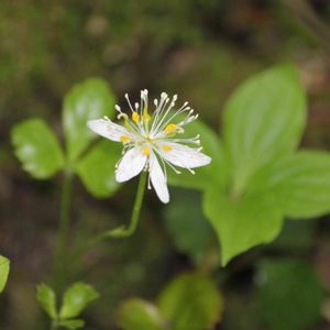 ミツバオウレン(三葉黄連) キンポウゲ科 別名 カタバミオウレン 凛とした姿がカワイイ。 後ろに三枚の葉、これがミツバオウレンの葉っぱ。 花弁に見える白色は萼片 中で黄色いのが花弁 薄い緑色が雌しべ いっぱいある白色の糸状が雄しべ 2018/7/11 撮影