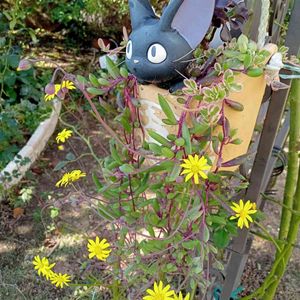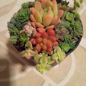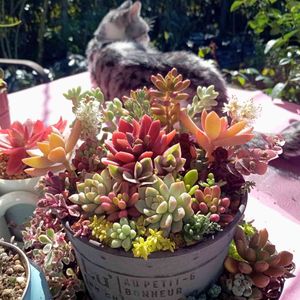 おはようございます☀ 先日、スカスカのタグ付きで載せちゃった寄植えが完成しました🙌 地植えしているセダムや育成鉢から、赤や黄色、お花を咲かせている子を選んでちまちま…幸せな時間です(*˘︶˘*).。*♡