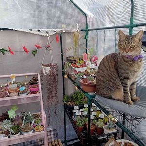 ハウスの中のメグ ここはメグの専用ハウスになりました🎵 他の子たちは、全く入って来ません。なので、いつもご機嫌なんです😻💕🎵 多肉さんたちもすくすく育っています✨🌱✨ 過保護になりすぎないようにしなくちゃね😆
