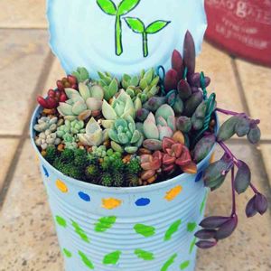 こんにちは(^^) 昭和の日 雨☔ 朝から最近購入した多肉の植え替えしてました😀 🍀寄せ植え🍀 その1 娘に貰った直径5センチの鍋に寄せ植え作りました(^^)