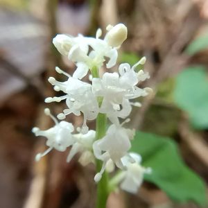 マイヅルソウ(舞鶴草)キジカクシ科マイヅルソウ属 今年は、すずらんの群生地と富士山麓2ヶ所で見ることができました。 マイヅルソウはやや高い山から亜高山帯、北国の森林や林縁、湿原などに見られる植物です。 花を咲かせる芽は茎を高さ10cm前後に伸ばして葉を2~3枚つけます。花が咲かない芽は大きめの葉を1枚つけます。葉は幅が広く、はっきりとした柄があります。葉の葉裏に毛はなく、この点で近縁種のヒメマイヅルソウと区別できます。花は径3mmで、茎の先端に長さ2~5cmの穂状につきます。花後に液果が数個つき、秋に赤く熟します。