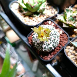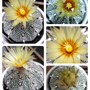 おはようございます🌵🌸 アストロフィツム スーパー兜🌵🌸 ①スーパー兜の親 ②~⑤実生した子供たち🌵🌵🌵🌵👶