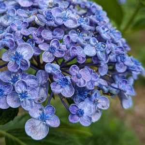 オタフクアジサイ(アジサイ科) アジサイ属 挿し木をして4年目~植替えもせず同じ鉢の中デス‥(^^ゞ ① 昨年までピンクだったけれど~今年はブルーに‥💜💙💜👍 内側に巻き込んで、アシンメトリーな花型は~少しづつ表情が変わっていて面白いです‥(*^^*) ② 中心部のお花も~咲いています…装飾花かな‥🤔 ③ 隠れる様に咲いている~星形のお花を見つけました…コレが両性花ですかネ‥👀!! 花弁が5枚、雄蕊10本、雌蕊3本~~可愛く咲いています‥🔍 ④ 葉っぱは~丸い穴だらけデス‥💦 アジサイハバチが悪さをするようです‥📝😢