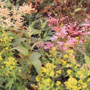 ヤマブキショウマ(山吹升麻) *バラ科ヤマブキショウマ属 花期は6〜8月 北海道〜九州の山地の林縁.草地.岩場などにも生育! 葉は、2回3出複葉で側脈が平行に並びヤマブキに似ている! 雌雄異株で、これは雄花! (雌花は、少し地味な感じがします) *似たトリアシショウマは 花期は7〜8月 小葉の脈は荒く不規則。 両性花で花の付き方は一様ではない。 葉は3回3出葉。雌雄同株。 宮城県県民の森