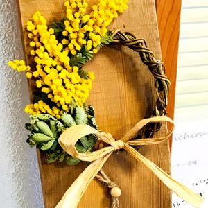 「ミニリース 」 手のひらサイズです。 会社の園芸農耕班の方に教えながら一緒に作成🌼 リースは柳、ミモザアカシア 共、園内に自生している物を収穫、結束して作ってもらいました。 んで、百均の紙テープをほぐしてリボンに。 私自身、まだ興味を持って日が浅いので試行錯誤中です😅