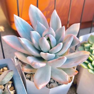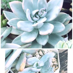 ✤発光✨✤ 朝の日陰のうちにタニパト👮♀️ 遮光シートの中でまるで光を放つように輝いてるコを発見👀 透き通った白肌に淡い水色の色彩の葉っぱ💙あ〜美しい(*˘︶˘*).。*♡ 奥の親株さんは水色が濃くて力強さも感じます💠よく見ると子株の株元から発根してるので、根詰まりしていそうです。涼しくなったらカットして独立させよう🌱 秋になったらメルカリ出品も再開予定です📦
