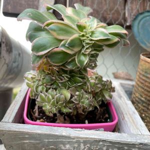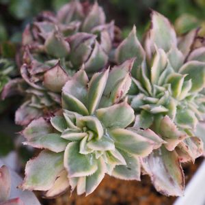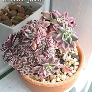 【アエオニウム属 サンバースト 綴化】 Aeonium urbicum f.variegata 'Sunburst' f.cristata ㊧ 【アエオニウム属 サンバースト】 Aeonium urbicum f.variegata 'Sunburst' 1日遅れですが みらい様主催の【🏷錦の日】に、 参加させていただきますね 柔らかな緑色の鋸葉に 中心は黄色の斑、外側はピンクの斑 以前、ネットフリマでこちらを 落札するか否かを迷っていたら、 灯台もと暗し🌊 近所のHCにてたまたま発見 その時の枯渇感 故なのか、 サンバーストの綴化を見付けると ついつい購入してしまい、 タニ友さん達から呆れられてる始末 ダッテ、スキナンダモン (;-ω-)ノ 11鉢目になるサンバースト綴化を、 日曜日に譲っていただきました しかも大苗、嬉しい♡(˃͈ દ ˂͈ ༶ )