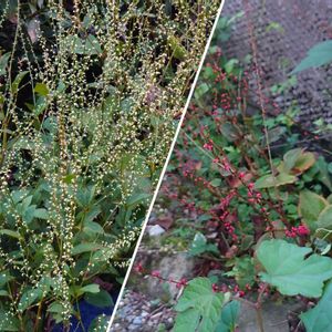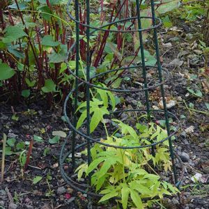 そろそろ紅葉はじまりました 赤くなり始めたのは隣のコスモスの影になったためあまり大きくならず早くも色づき始め、手前のは日向にいるので、どんどん大きくなり色づきが遅い ちょっとした環境の違いで成長度が違うのかな