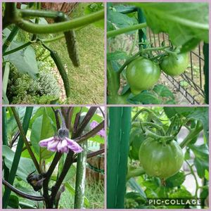 家庭菜園の野菜たち😃 トマトが大きくなったよー😆 5㎝くらいかな🍅 キュウリもモリモリ育っています🥒 今まで2本収穫して3番4番目はこの子達😃 一緒に収穫できそうです🥒🥒 茄子も可愛い実が出来てきました🍆 まだヘタに隠れてよく見えないけど育っています😊 実が成る植物は楽しですね💕