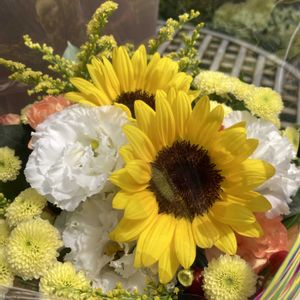 ひまわり🌻 ヒメヒマワリ💛 スプレーバラ・エクレール💚 夏らしいかわいい花束💐 しばらく飾ってから ドライにしようかな♪🍃