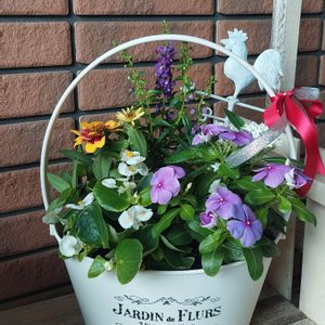 お店で売っていた寄せ植えが可愛かったので、ピックを足して、友人にプレゼントしました。 とても喜んでくれました~.:*:・'°☆