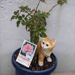 今晩は、☔ですね 広島から息子夫婦+😺ロキ君が来たよ!! 私の大好きなブライダルピンクの薔薇と可愛い😺の置物プレゼント🎁貰ました〜 早速植木鉢に… 優しさと思いやりに有り難く感無量てす💞 早くお花みたいなぁ✨🎶