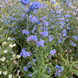 「今日のお花」 ワスレナグサ これは、シナワスレナグサ、です。💙✨ 芽🌱が出てきた頃は、小さいワスレナグサの品種と、葉の感じは違います。 でも、こんな風に、伸びてくると、葉の感じも同じ様です。 50センチから70センチ位大きく成ります。 小さいのも可愛いですが、この大きいのも、綺麗ですよ。✨💝 奥に見えるのは、白のオルレア、ピンクのマーガレットです。💟💗