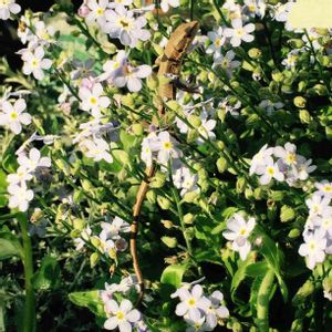 忘れな草のようなかわいい青いお花を お迎えした(о´∀`о) バラの間に キャットミントとともに植え込み〜〜💙 朝から 水撒きしているオット君 お願いだから 花の上からの 水撒きは やめてほしいのだ( ;∀;)