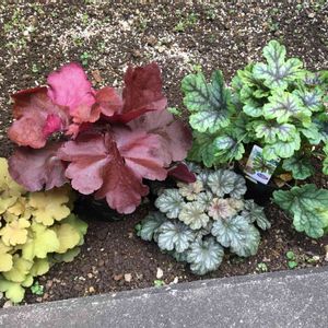 🌿ヒューケラ🌿 庭のグランドカバーにしようと思って4種類選びました(^з^)-☆ 左から キャラメル🌿 ファイヤーアラーム🌿 ハリウッド🌿 タペストリー🌿