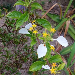 花友さんの庭の植物たちです。 毎年咲いています。 ①コンロンカ(崑崙花) ②ツルハナナス ③斑入りカラー黄色 ④千両の花 ⑤キウイフルーツ 🏷️黄色い金曜日