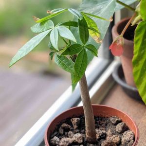 今日のパキラ 根っこ消失からの植替えで、ゆっくりですが葉っぱも増えてきた(現状4枚) うしろで植え替え仲間のベゴニア氏が見守ってます😳